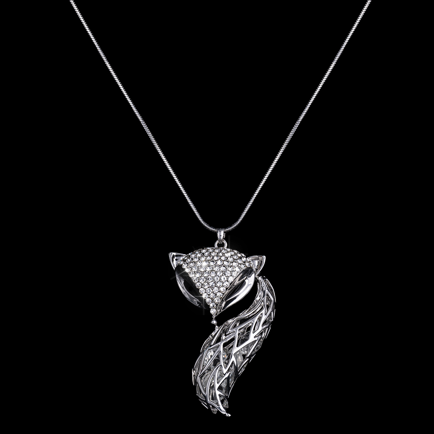 Modeschmuck Kette (Vierkantkette Länge 90+5 cm) & Anhänger Fuchs (Länge ca. 5,5cm, Breite ca. 3cm), poliert, imitiertes Rhodium, Kristallsteine, nickelfrei,