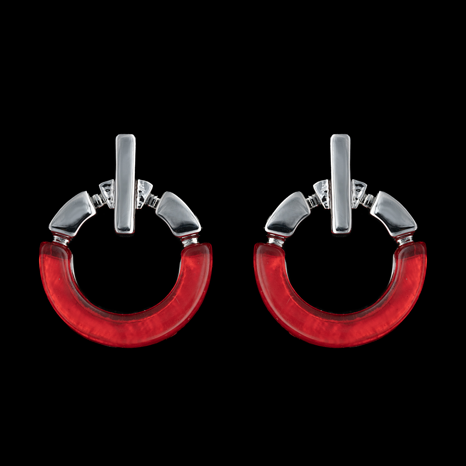 Modeschmuck Ohrstecker rund mit rotem Harzstein, imitiertes Rhodium, poliert, Länge ca. 2,2cm, Breite ca. 1,7 cm, Ohrsteckerstift oben, nickelfrei